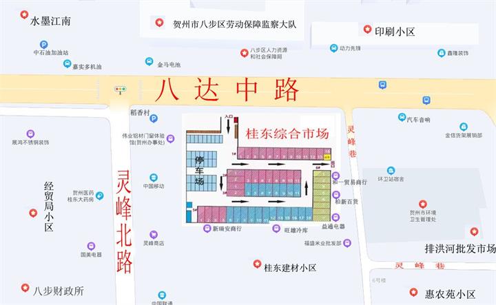 地址位于賀州市八達(dá)中路32號(hào),地理位置優(yōu)越,在靈峰北路與八達(dá)中路交界處,屬賀州市城區(qū)雜貨批發(fā)商圈核心,一墻之隔有三大電信運(yùn)營商,人流密集、交通便利。